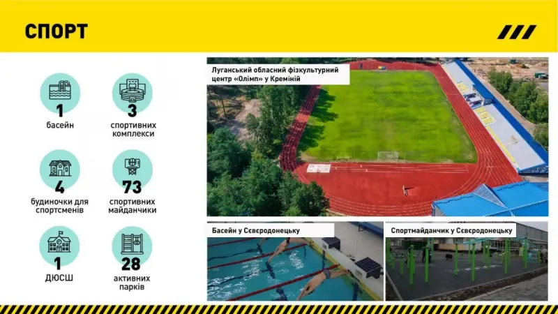 "Крім того, Луганщина – один з пілотних регіонів програми Президента "Здорова Україна": ми побудували 73 спортивних майданчики та облаштували 28 локацій "Активних парків", також оновлених за дорученням Президента України", – додав Гайдай.