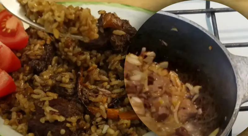 Додайте в каструлю м'ясо (зазвичай баранина або яловичина) і обсмажте його разом з цибулею, щоб воно набуло красивий рум'яний відтінок. Потім обережно промийте рис у холодній воді, щоб видалити надлишок крохмалю. Після цього додайте рис в каструлю і акуратно розрівняйте його, не перемішуючи з м'ясом і цибулею.