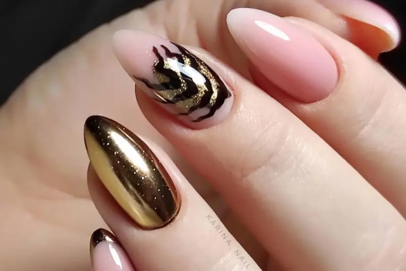 Якщо всього лише один нігтик покрити срібним або золотим лаком, то вийде розкішний нюдовий манікюр на рік тигра. Можете також зробити приголомшливий френч - для цього основу пофарбуйте нюдовим лаком, а посмішку зробіть срібною.