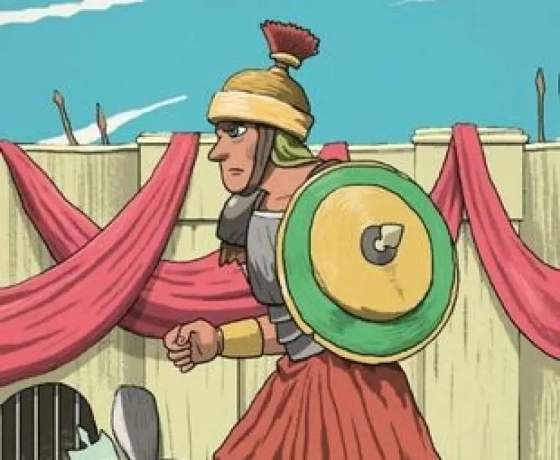 На картинці ми бачимо гладіатора, який готується до бою. Але йому не вистачає найважливішого предмета – його меча.