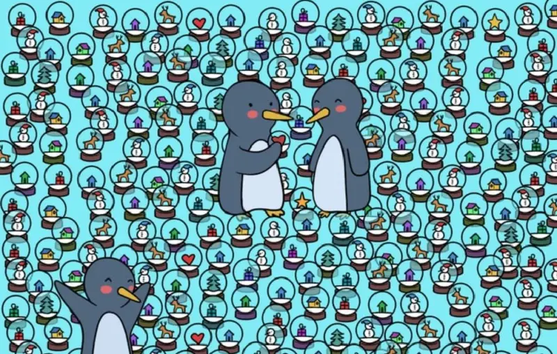 На картинці ми бачимо велику кількість сувенірних скляних куль, всередині яких є різні предмети – ялинки, будиночки, олені, подарунки, сніговики і серця. Серед куль ходять пінгвіни, які, очевидно, підбирають для себе сувеніри, пише Brightside. Увесь цей сюжет розташований на блакитному тлі.